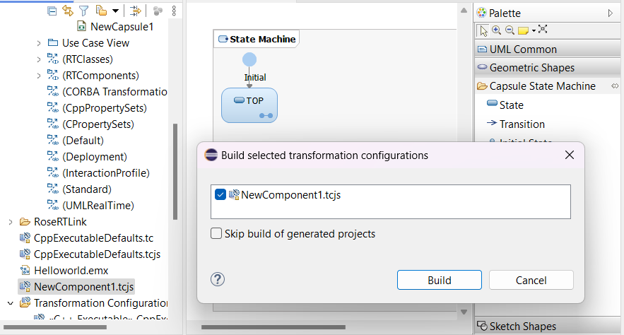 Note: Before building the component, ensure that the compiler selected is compatible with the TargetRTS configuration. In many cases, the development environment for RoseRT may be using an outdated compiler. When transitioning to build the same component using Model RealTime, it's often necessary to update the development environment by switching to a more recent compiler version. For more information, see Post Migration Best Practices.