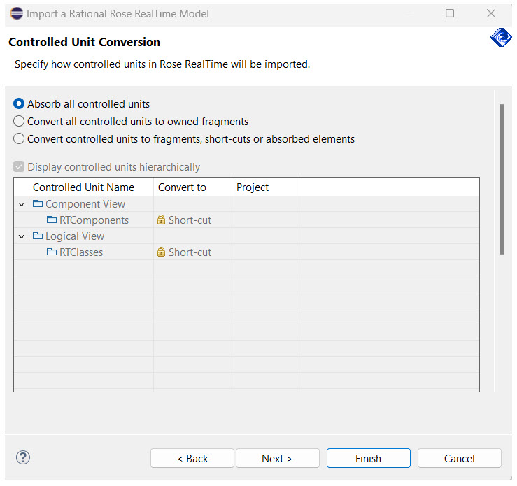 The Import a Rational Rose RealTime model wizard has several pages that provide options on how to import the model into DevOps Model RealTime. The most significant is the "Controlled Unit Conversion" page, which allows you to select how the different controlled units in the RoseRT model are migrated into Model RealTime. A "Controlled Unit" is a separate file that stores a particular model element at its root. Controlled units allow you to edit elements such as packages and classes independently of other elements in the source control system. The corresponding terminology in Model RealTime is called a "fragment", which is essentially the same thing as a controlled unit.