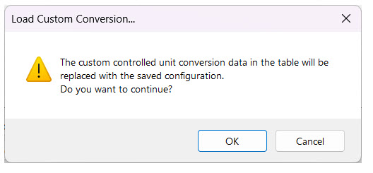 The "Load Custom Conversion" button is disabled unless a custom conversion configuration file exists in the workspace at the location specified above. When enabled, you can click this button to load the current settings into the dialog. A warning dialog will appear to ensure that you want to perform the operation.
