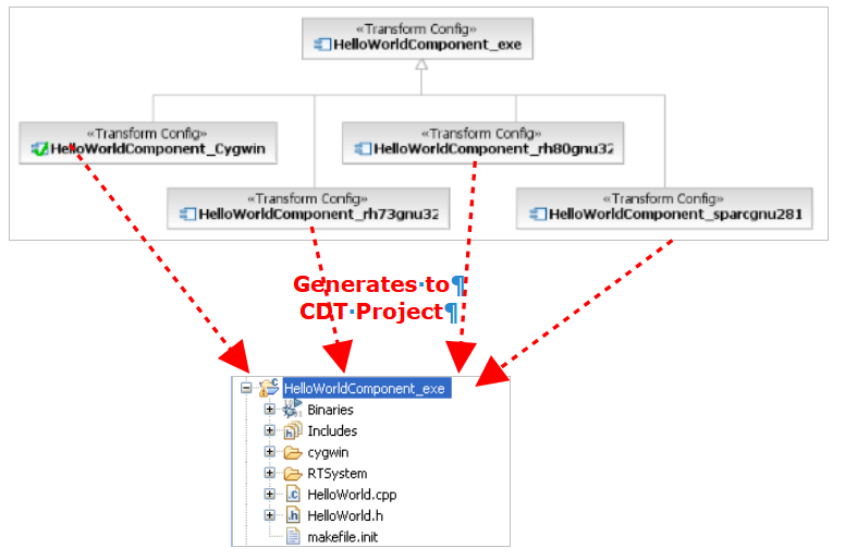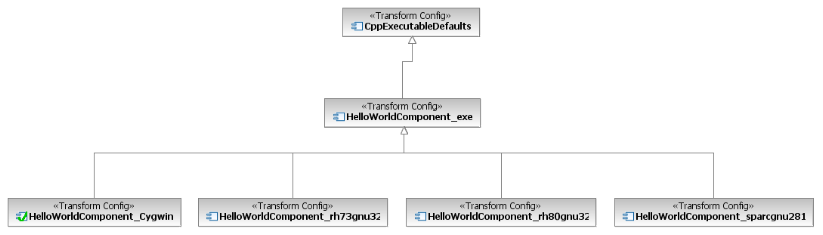 Post migration, the components now exist as TC files that inherit from a newly merged TC file that contains all the common generation properties. This means that changes to the generation can be centrally managed in that abstract TC (e.g. adding / removing sources etc.). All the concrete TCs will generate in a single CDT project that has multiple configurations – one for each target (cygwin, sparcgnu281 etc.).