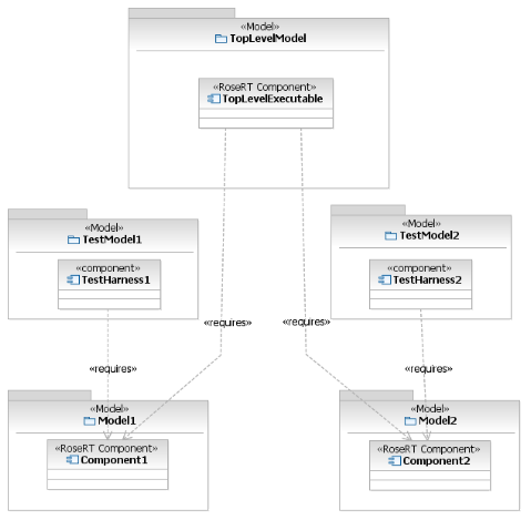 In the separated model, four new models are created to isolate the test artifacts from the production code. The "TopLevelModel" shares in the components and packages from Model1 and Model2, but doesn’t require any visibility of the associated test artifacts. This separation keeps the model foot print smaller and will ease the model migration process because the model import wizard requires less memory.