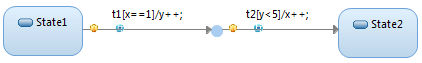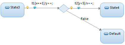 Junction points can be used before, or after a choice point, or both. All guards for transitions compounded by junction points must evaluate to true for that path to be considered enabled. For example, in the following case, x==1 && y < 5 must be true for t1 to fire. Once fired, y and x increment. The behavior reaches the choice point and z<5 && y>=5 must evaluate to true to transition to S2.